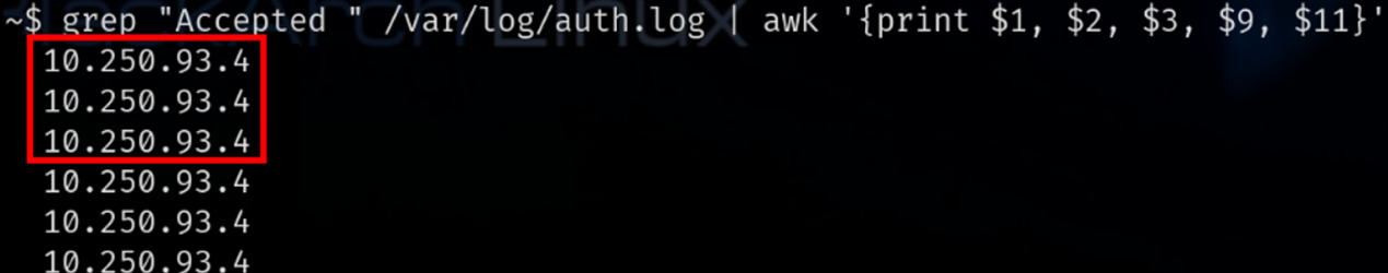 grep "Accepted " /var/log/auth.log | awk '{print $1, $2, $3, $9, $11}' |